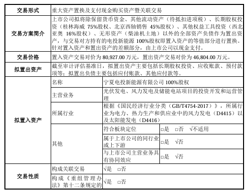 根据报告书,公司拟将除货币资金、其他流动资产、长期股权投资、其他权益工具投资以及无形资产之外的全部资产与负债,作为置出资产,与交易方所持有的电投新能源100%股权即置入资产的等值部分进行置换。